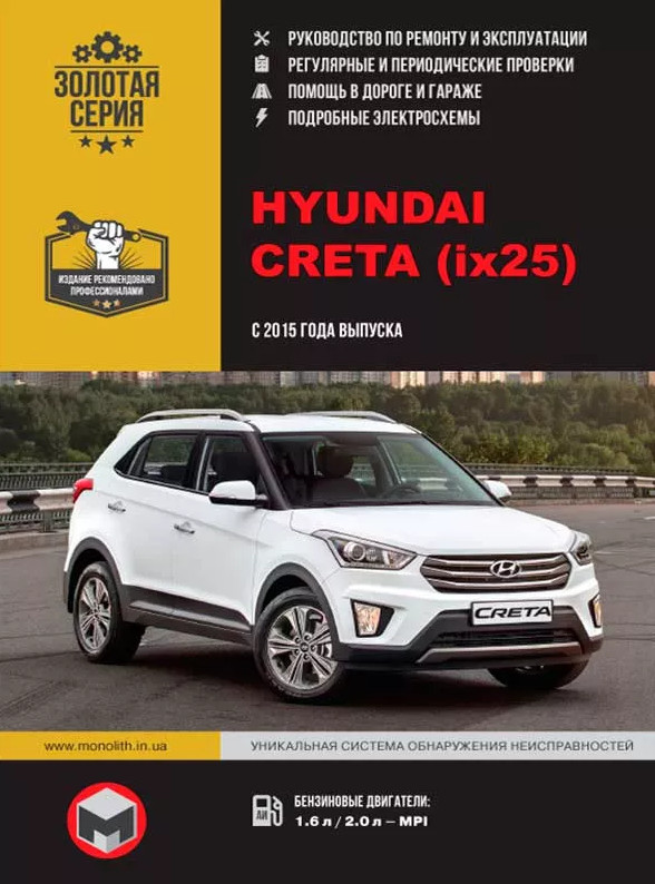 Руководство по ремонту Hyundai Creta (ix25), инструкция по эксплуатации Хендай Крета, книга по обслуживанию Хендай Грета с 2015 г. выпуска, оборудованных бензиновыми двигателями рабочим объемом 1,6 и 2,0 литра, и как автоматической, так и механической коробкой передач.