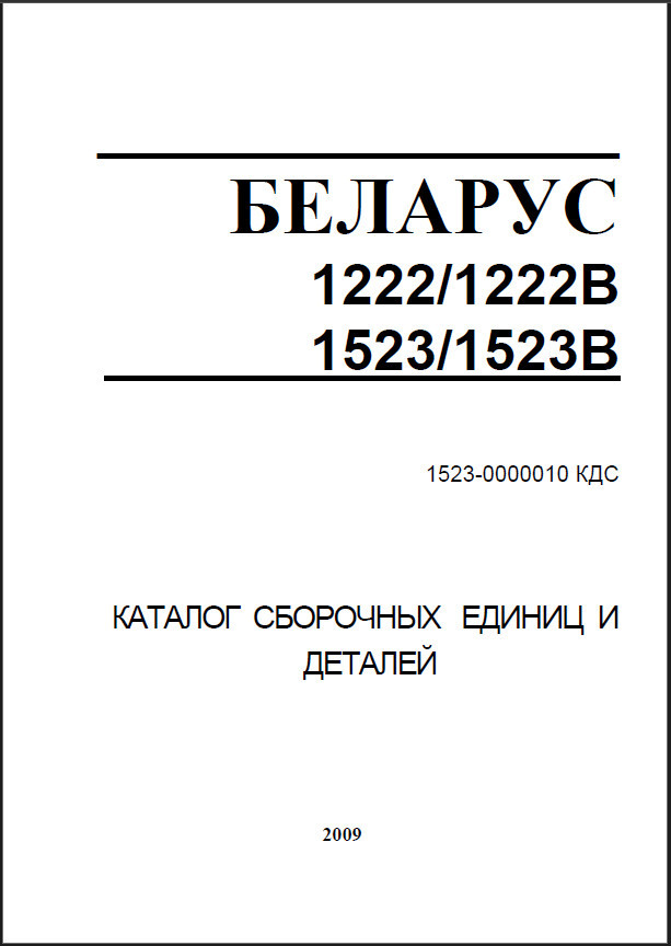 Каталог деталей и сборочных единиц МТЗ 1222 / 1222В / 1523 / 1523В. Книга содержит краткую техническую характеристику и развернутые спецификации всех узлов и деталей. В спецификации указаны обозначения узлов и деталей, их наименование, количество на одну сборочную единицу, материал и вес. Каждая группа сопровождается иллюстрациями.