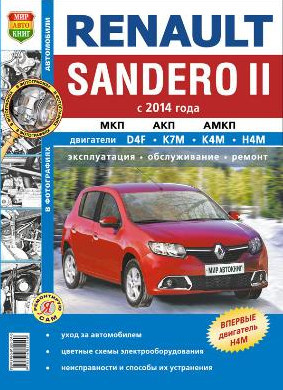 Руководство по ремонту Renault Sandero 2, инструкции по эксплуатации и техническому обслуживанию автомобилей Рено Сандеро 2 с 2014 года выпуска, оборудованных двигателями рабочим объемом 1,2 л. (16V), 1,6 л. (8V), 1,6 л. (16V).